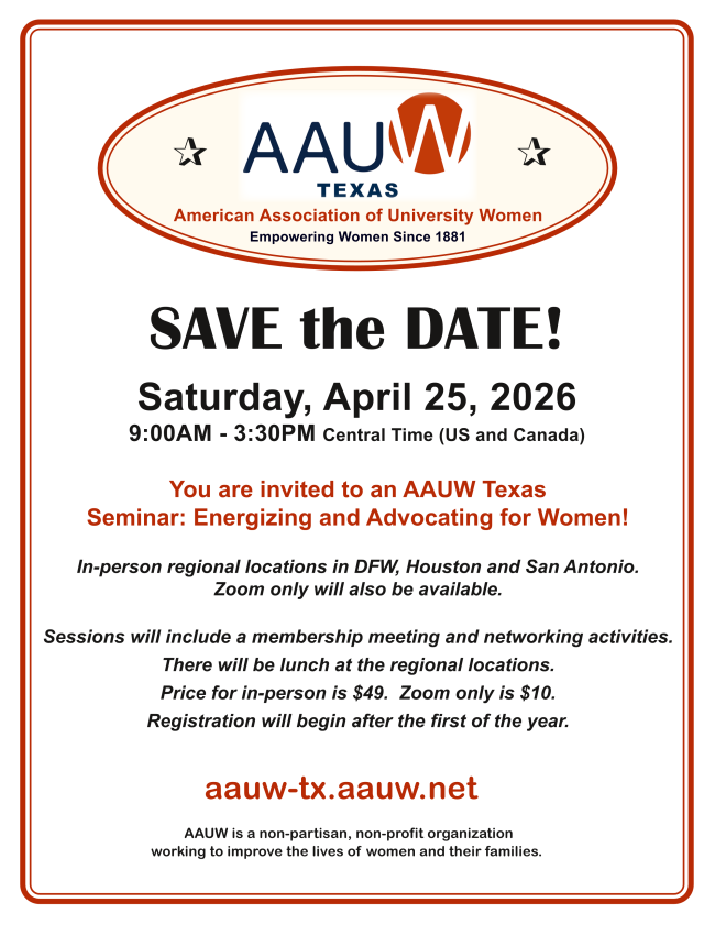 Is your branch interested in submitting an application for the AAUW Texas SHARE (Supporting Hardworking Affiliates Rising to Empower) Deadline for applications are February 1, 2026. AAUW Texas Project Application 2026